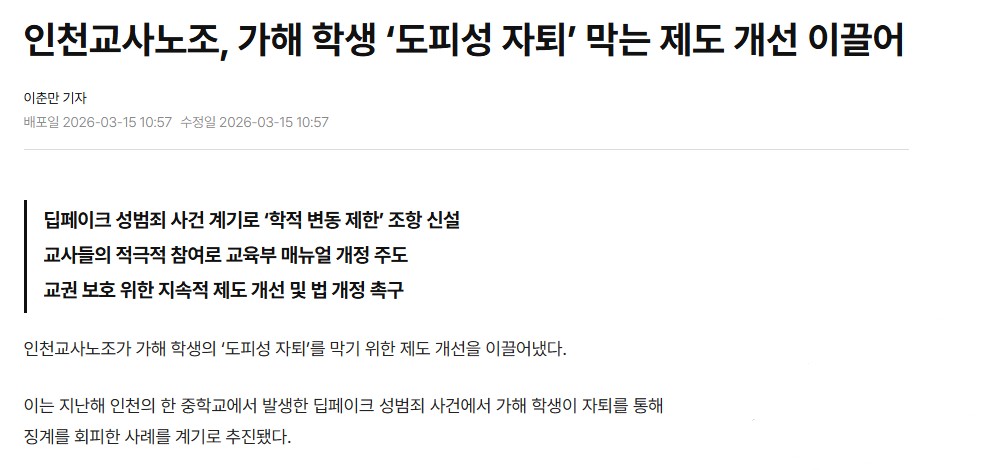 교권침해 후 “자퇴하면 끝?” 이제 아닙니다. 인천교사노조가 제도를 바꿨습니다.(26.03.16) (2026-03-16)
